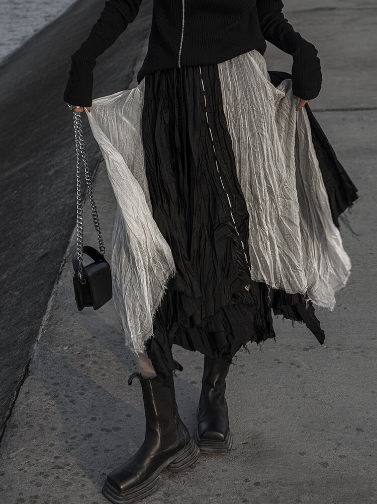 不規則な裾が印象的な不規則モードスカート。白と黒のバイカラーがモードな印象を与え、着るだけでおしゃれ度がアップします。歩くたびに裾が揺れます。Tシャツでもシャツやブラウスでも合わせやすい◎