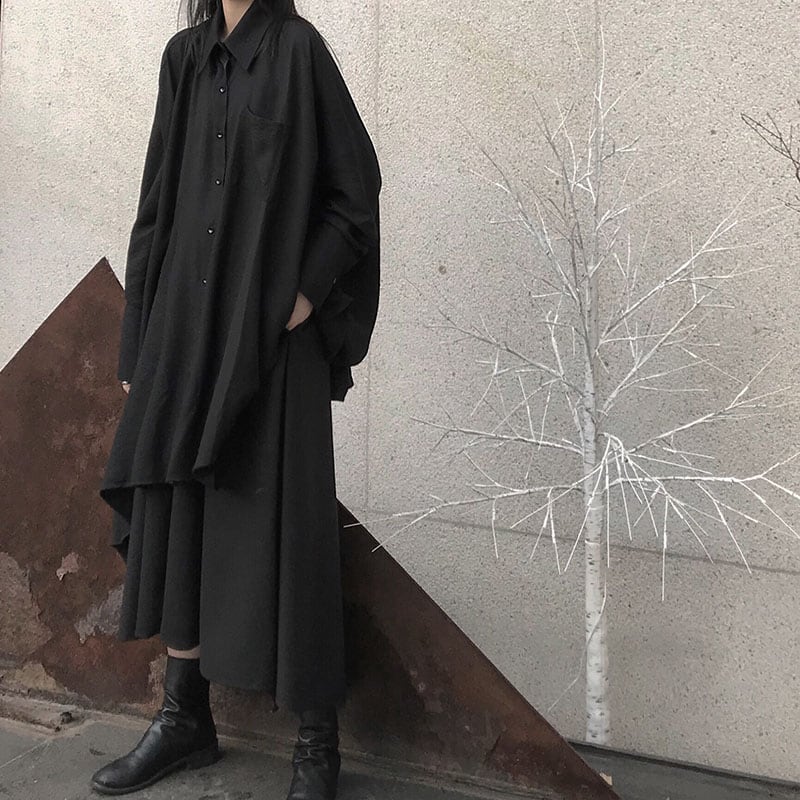 美しい落ち感と風になびく不規則な裾が特徴のミドル丈シャツワンピース。モードな雰囲気とこなれ感を演出するアイテムで、おしゃれな大人女性にぴったりの一枚です。シンプルなデザインながらも、裾の特徴的なカッティングが個性を引き立てます。