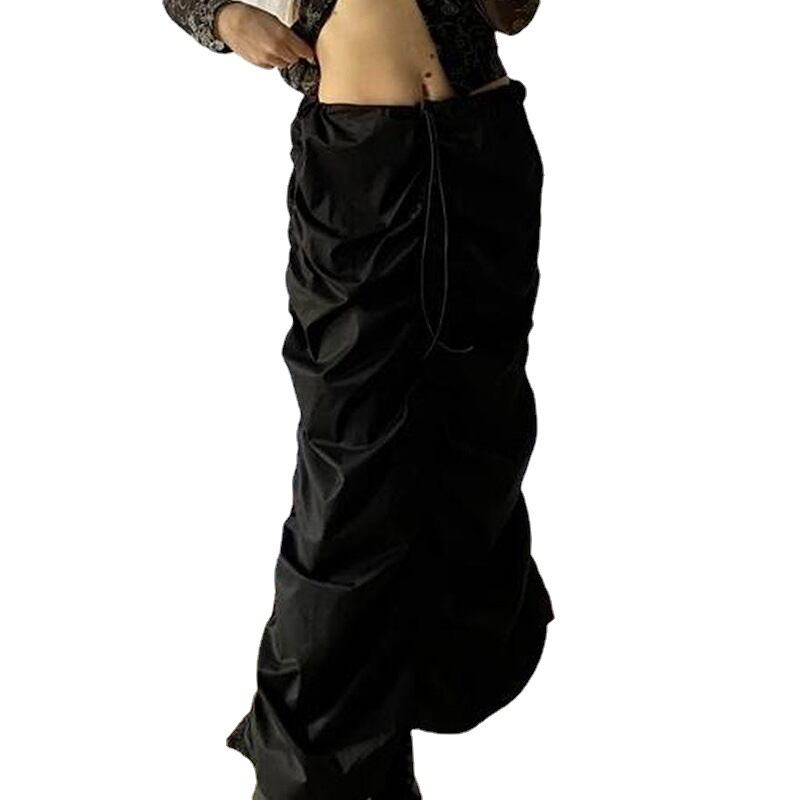 トレンドのシャーリングデザインが施されたこのロングスカートは、どんなトップスとも相性抜群です。オールブラックで大人っぽく決めたい日にぴったりのアイテムです。